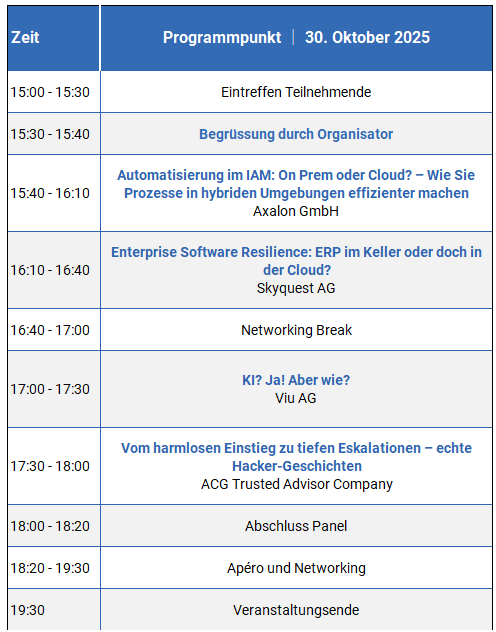 Viele Unternehmen stehen vor der Herausforderung, dass Prozesse in Bezug auf Identity & Access Management nicht (genug) automatisiert sind – und das teils unabhängig davon, ob Sie bereits ein IAM-Tool im Einsatz haben oder nicht. Häufig existieren hybride Umgebungen und hinzu kommt die Frage in Bezug auf das Bereitstellungsmodell für IAM selbst: On Prem oder doch «mutig» in die Cloud? Wir zeigen Ihnen auf, welche Ansätze für wen warum sinnvoll sind & wie Sie mit und ohne bestehendes IAM-Tool einen höheren Automatisierungsgrad im IAM erreichen!